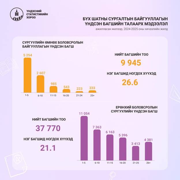 ЮНЕСКО-оос 1994 онд жил бүрийн аравдугаар сарын 5-ны өдрийг “Дэлхийн багш нарын өдөр” болгон тэмдэглэж эхэлсэн түүхтэй. Тэгвэл удахгүй болох багш нарын баярыг тохиолдуулан ҮСХ-ноос дараах статистикийг танилцууллаа.