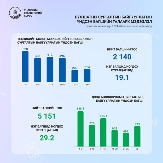 Харин дээд боловсролын сургалтын байгууллагын нэг багшид дунджаар 29 сурагч ногдож байгаа талаар Үндэсний статистикийн хорооноос мэдээллээ.
