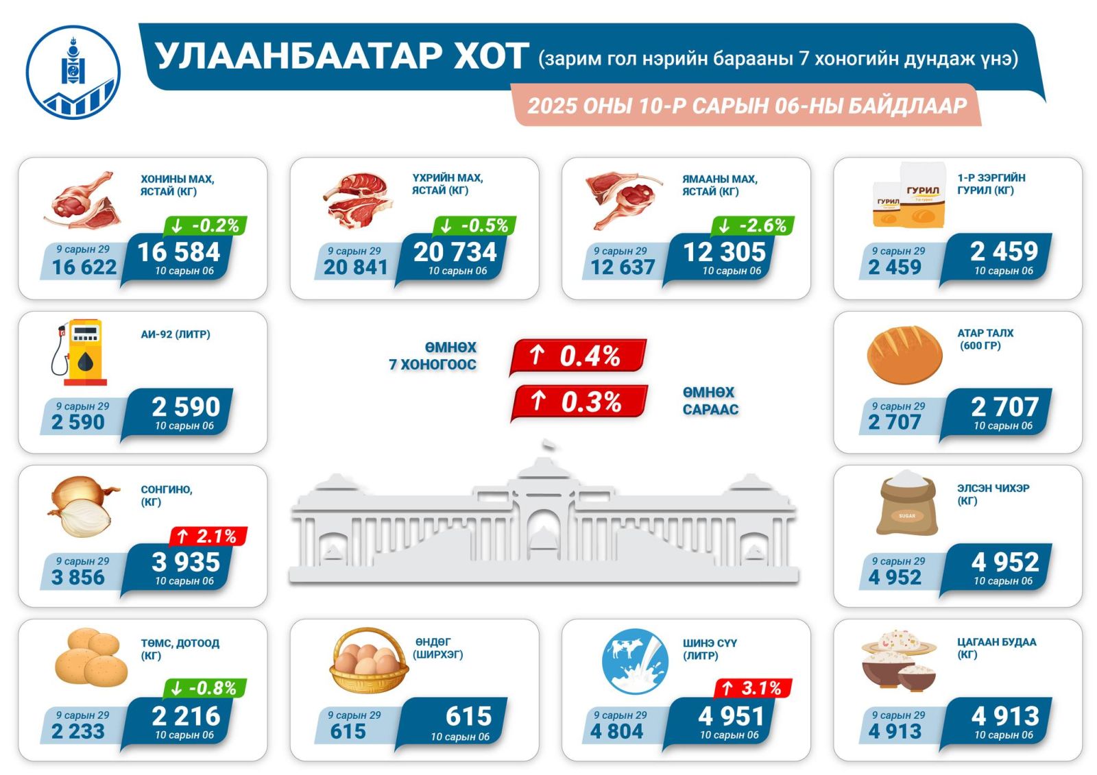 2025 оны аравдугаар сарын 6-ны байдлаар гол нэрийн зарим барааны үнэ өмнөх сараас 0.3 хувь, өмнөх 7 хоногоос 0.4 хувиар тус тус өссөн байна.