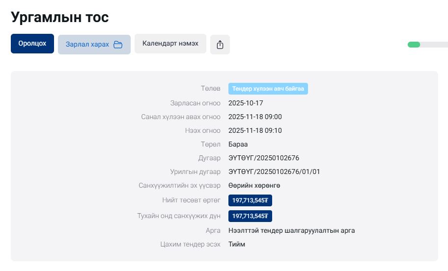 Тодруулбал, аравдугаар сарын 17-нд тухайн тендерийг зарлаж, арваннэгдүгээр сарын 18-ныг хүртэл материал хүлээж авахаар заажээ. Ингэхдээ тос худалдан авах мөнгийг өөрийн хөрөнгөөс гаргана гэсэн байна.
