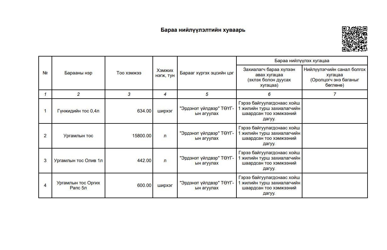 "Эрдэнэт үйлдвэр" ТӨҮГ-аас 197 сая 713 мянга 545 төгрөгөөр ургамлын тос худалдан авах тендер зарласан байна.