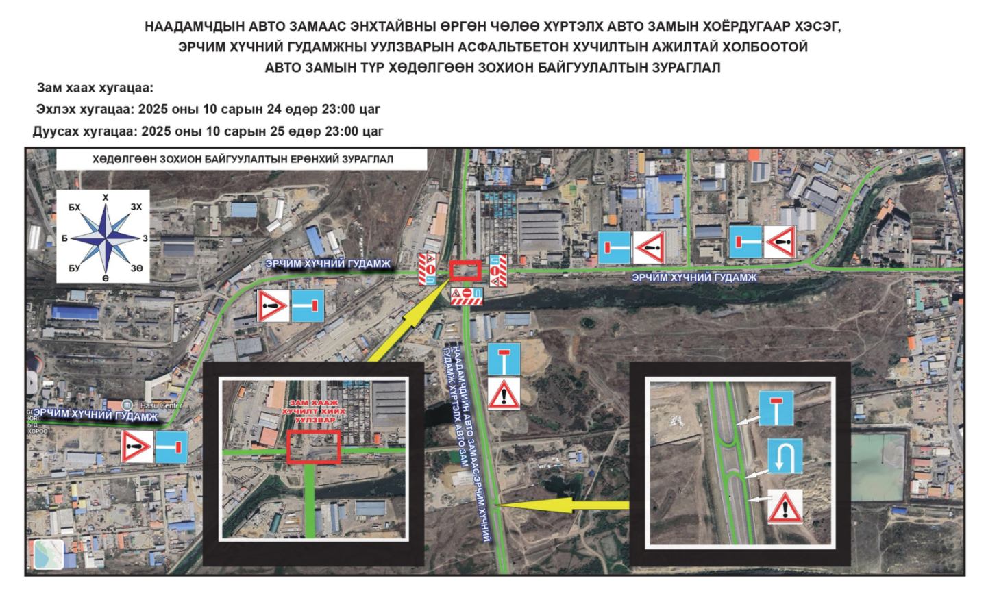 Эрчим хүчний гудамжны уулзварыг нэг хоног хааж, асфальтбетон хучилтын ажил хийхээр болжээ. Тодруулбал, Баянгол дүүргийн 20 дугаар хороо Наадамчдын авто замаас Энхтайваны өргөн чөлөө хүртэлх авто замын хоёрдугаар хэсэг, Эрчим хүчний гудамжны уулзварын автозамыг ирэх Баасан гаригт буюу аравдугаар сарын 24-ний 23:00 цагаас хааж асфальтбетон хучилтын ажлыг эхлүүлнэ.