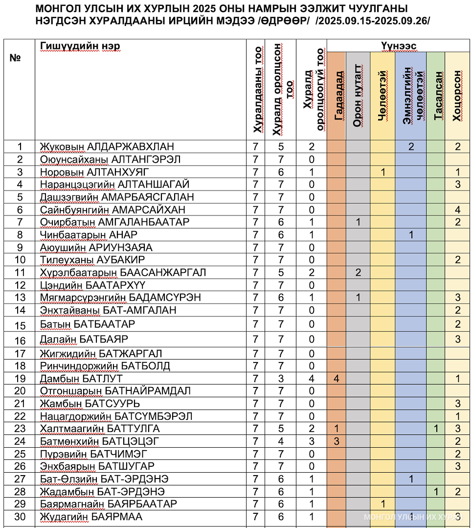 УИХ-ын 2025 оны намрын ээлжит чуулганы нэгдсэн хуралдааны есдүгээр сарын ирцийн мэдээг хүргэж байна. Есдүгээр сард УИХ-ын чуулган нийт долоон удаа хуралджээ. УИХ-ын гишүүн Ж.Ганбаатар, С.Цэнгүүн нар эдгээр долоон хуралдаанд нэгд нь ч оролцоогүй байна.