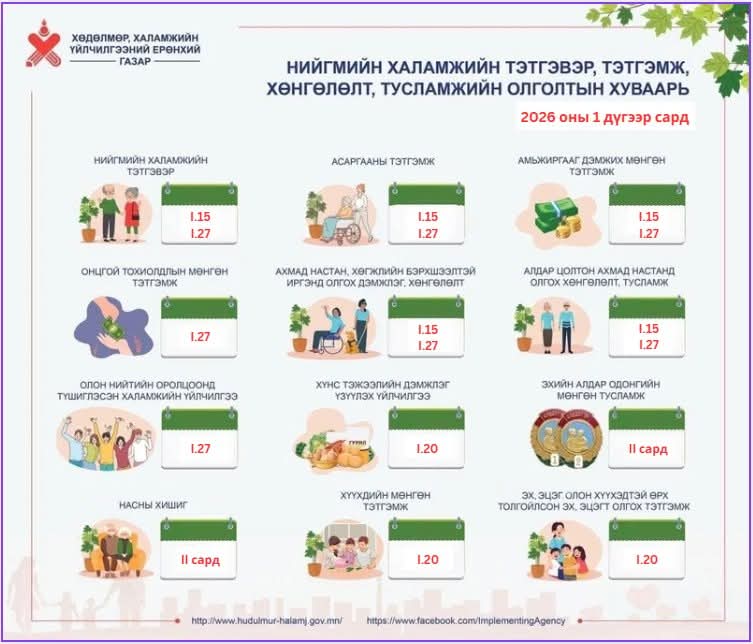 Тодруулбал, Нийгмийн халамжийн тэтгэврийг энэ сарын 15 болон 27-ны өдрүүдэд олгохоор төлөвлөсөн бол асаргааны тэтгэмж, амьжиргааг дэмжих мөнгөн тэтгэмж мөн адил эдгээр өдрүүдэд дансанд шилжинэ.