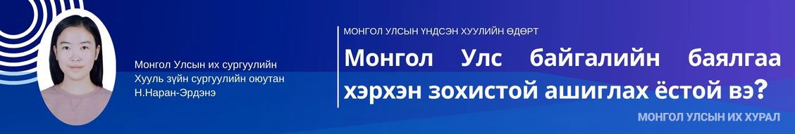 Монгол Улсын Үндсэн хуулийн өдөрт зориулан Улсын Их Хурлын Тамгын газар, Парламентын судалгаа, хөгжлийн хүрээлэнгээс зохион байгуулсан “Монгол Улс байгалийн баялгаа хэрхэн зохистой ашиглах ёстой вэ” сэдэвт уралдааны их, дээд сургуулийн оюутны ангилалд хоёрдугаар байр эзэлсэн Монгол Улсын их сургуулийн Хууль зүйн сургуулийн оюутан Н.Наран-Эрдэнийн эсээг толилуулж байна.