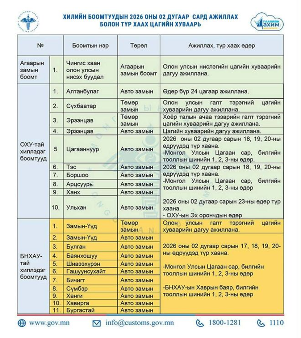 Хоёрдугаар сард хилийн боомтууд дараах хуваарийн дагуу ажиллана.