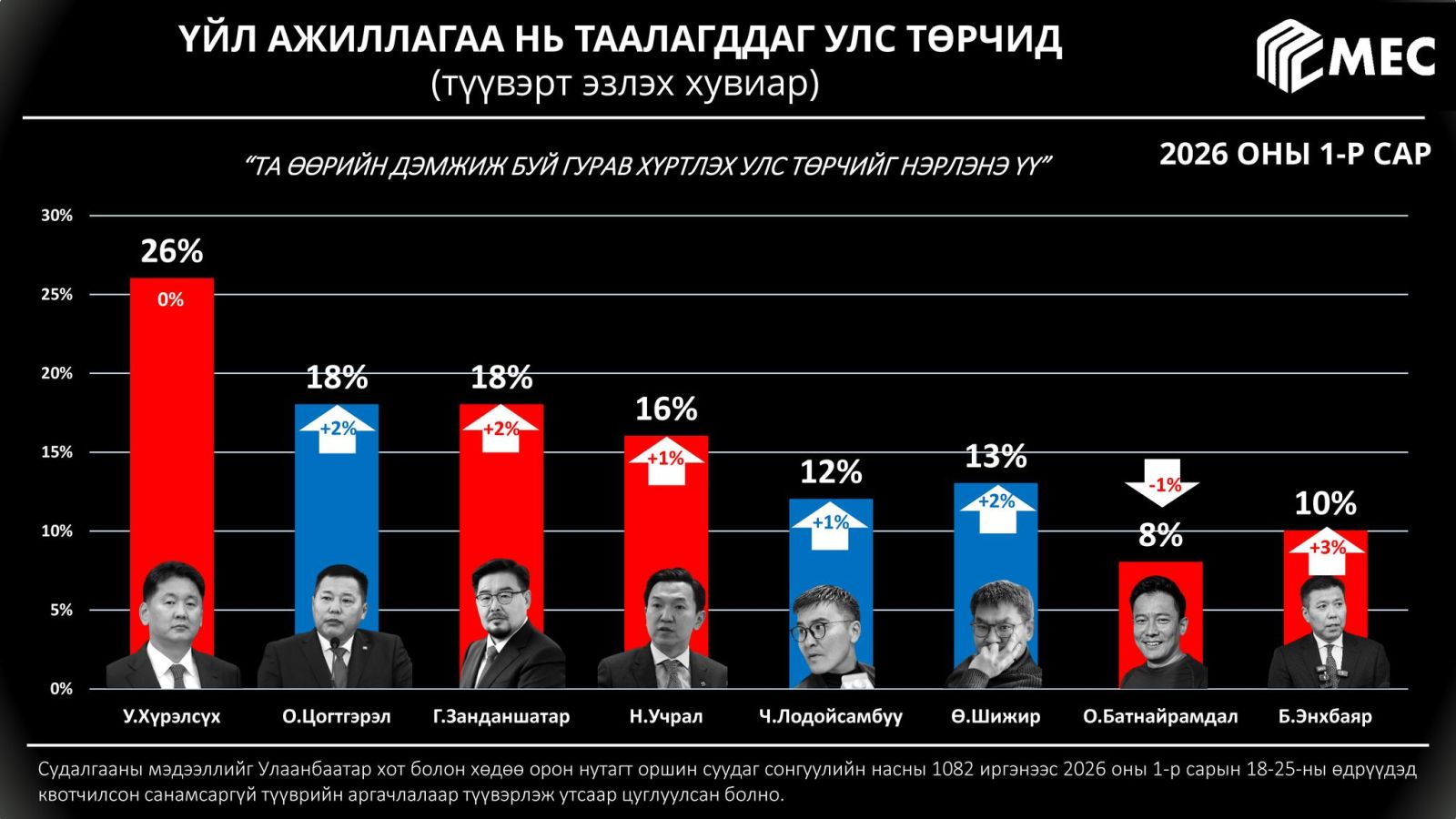 "МЭК" судалгааны байгууллагаас улс төрчдийн рейтингийн судалгааг сар бүр хийж, танилцуулдаг билээ. Уг судалгааны нэгдүгээр сарын дүн гарчээ.