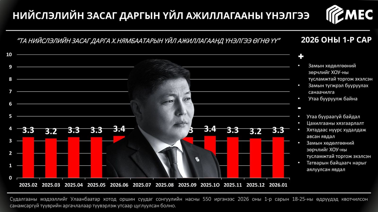 Нийслэлийн Засаг дарга Х.Нямбаатарын тухайд, рейтинг нь өсжээ. Түүнийг иргэд дүгнэхдээ "Замын хөдөлгөөний зөрчлийг хиймэл оюун ухааны тусламжтайгаар торгож эхэлсэн", "Замын түгжрэл бууруулах санаачилга", "Утааг бууруулж байна" хэмээн дүгнэсэн байна. Харин зарим иргэд "Утаа буураагүй байдал", "Цахилгааны хязгаарлалт", "Хятадаас нүүрс худалдаж авсан явдал", "Замын хөдөлгөөний зөрчлийг хиймэл оюун ухааны тусламжтайгаар торгож эхэлсэн", "Татварын байцаагч нарыг аялуулсан явдал" хэмээсэн байна. Ийн түүний үйл ажиллагааг 3.3 оноогоор үнэлжээ.