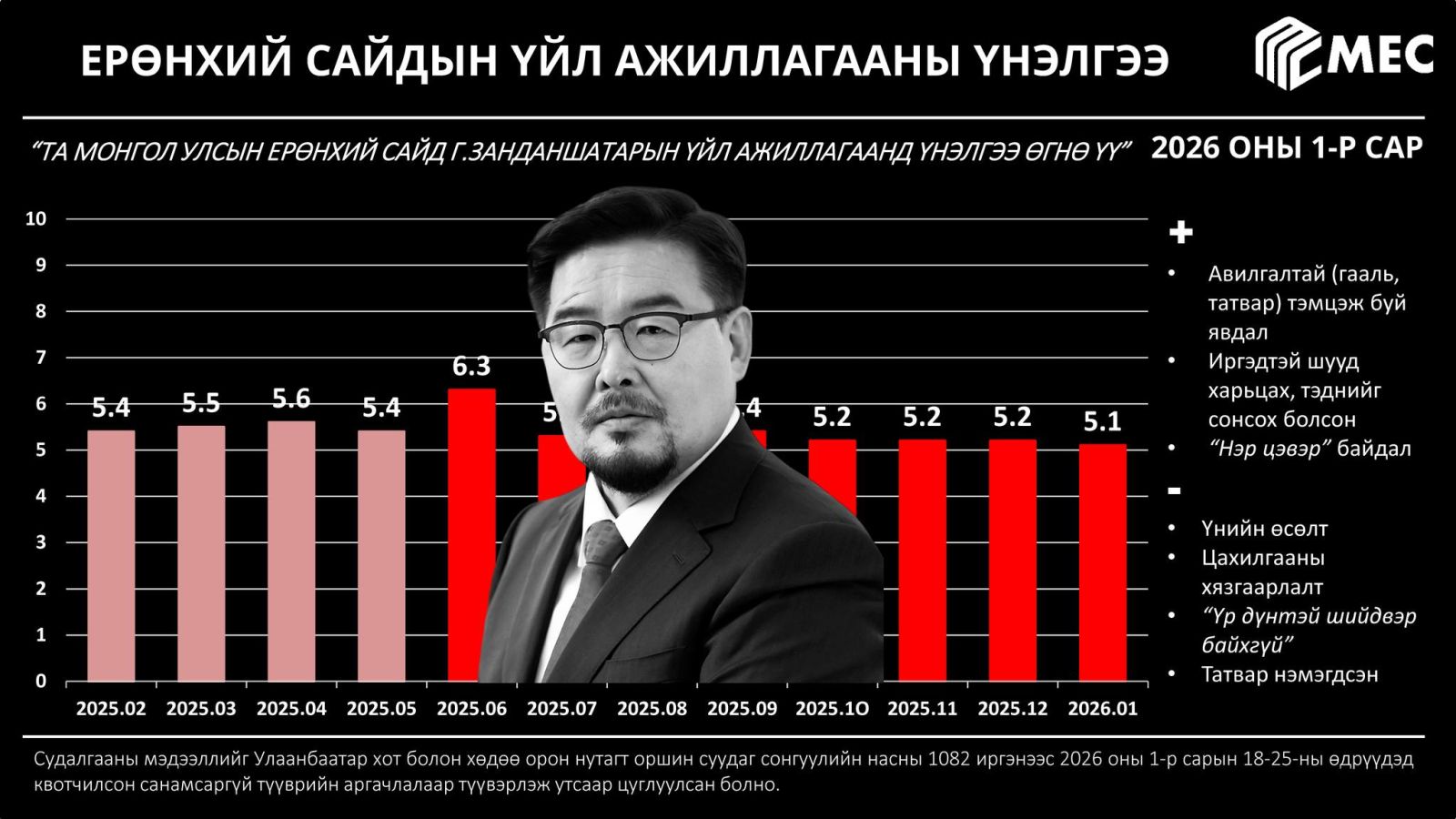Харин Ерөнхий сайд Г.Занданшатарын тухайд, рейтинг нь буурсаар байна. Тэрбээр арванхоёрдугаар сард 5.2 оноо авч байсан бол нэгдүгээр сард 5.1 болжээ. Иргэд түүнийг дүгнэхдээ "Гааль, татвар зэргээр авлигатай тэмцэж буй", "Иргэдтэй шууд харьцах, тэднийг сонсох болсон", "Нэр цэвэр" зэргээр сайшаасан байна. "Үнийн өсөлт", "Цахилгааны хязгаарлалт", "Үр дүнтэй шийдвэр байхгүй", "Татвар нэмэгдсэн" гэх мэтээр сөрөг сэтгэгдэл илэрхийлжээ.
