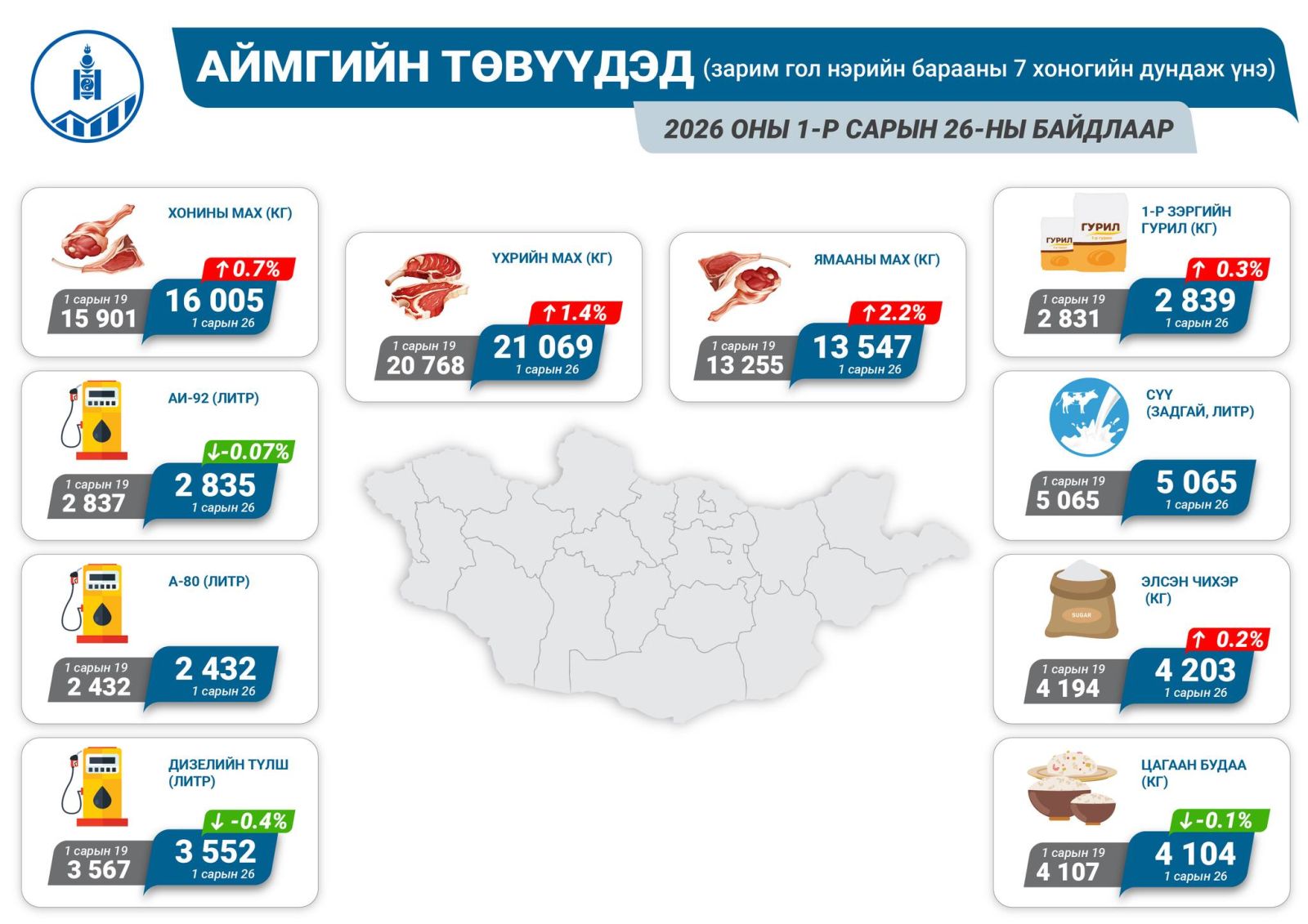 Мөн 2026 оны нэгдүгээр сарын 26-ны байдлаар аймгийн төвүүдэд зарагдаж байгаа гол нэрийн зарим хүнсний барааны дундаж үнэ өмнөх сараас 5.9 хувь, өмнөх 7 хоногоос 0.7 хувиар тус тус өссөн үзүүлэлттэй гарчээ.