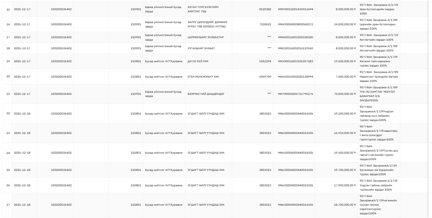 Тодруулбал, арванхоёрдугаар сарын 15-нд Нийслэлийн Засаг даргын тамгын газраас Нийслэлийн Соёл урлагийн газар руу "Улаанбаатар мөнгөн шөнө а/х зардал" гэсэн утгатайгаар 547 сая 445 мянган төгрөг шилжүүлсэн байгаа юм. Мөн "Иргэдэд зориулсан шинэ жилийн арга хэмжээний зардал" нэрээр 103 сая 995 мянган төгрөг, "Мөсөн хотхон" нэрээр 230 сая төгрөг шилжүүлсэн байна.