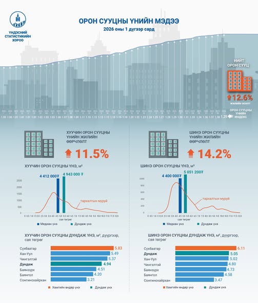 2026 оны нэгдүгээр сард орон сууцны үнийн индекс 1.39-д хүрч, өмнөх оны мөн үеэс 12.6 хувиар, өмнөх сараас 0.7 хувиар тус тус өссөн гэж Үндэсний статистикийн хорооноос мэдээллээ.