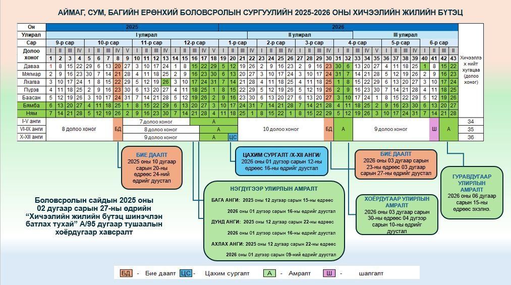 2025–2026 оны хичээлийн жилд ерөнхий боловсролын сургуулийн сурагчид дараах байдлаар хичээллэхээр батлагдсан.