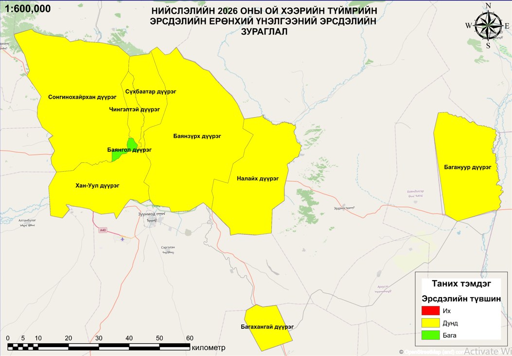 Нийслэлийн хэмжээнд 2025 онд 5 удаагийн ойн гал түймэр бүртгэгдсэнээс Баянзүрх дүүрэгт-2, Чингэлтэй дүүрэгт 1, Хан-Уул дүүрэгт 2 удаа бүртгэгдэж 37,8 га талбай өртөж, 40,9 сая төгрөгийн хохирол учирсан. Мөн 356 удаагийн шар өвсний гал түймэр бүртгэгдэж, 430,62 га талбай өртсөн байна.
