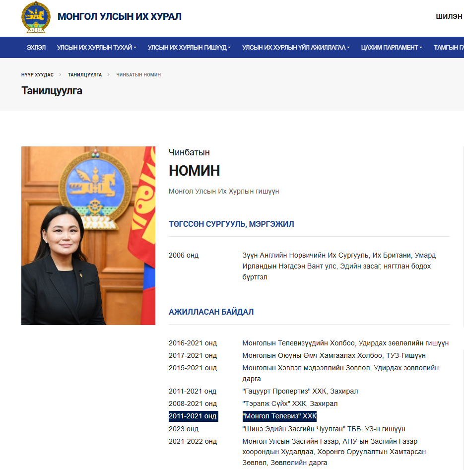 Сануулахад, "Монгол телевиз" ХХК-ийн эцсийн өмчлөгч нь Цахим хөгжил, инноваци, харилцаа холбооны сайд Ч.Номингийн аав Л.Чинбат бүртгэлтэй байна. Мөн Ч.Номин сайд 2011-2021 оны хооронд тус компанийн удирдлагаар ажиллаж байсан нь нээлттэй мэдээллийн санд байгаа юм.