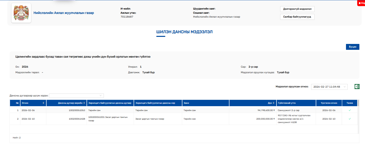 Тодруулбал, Шилэн дансны мэдээллийг харахад өнгөрөгч хоёрдугаар сарын 10-нд Нийслэлийн Засаг даргын тамгын газраас Нийслэлийн Аялал жуулчлалын газрын данс руу 200 сая төгрөг шилжүүлсэн байгаа юм. Ингэхдээ, гүйлгээний утгыг нь "Улаанбаатар хотыг сурталчлах, мэдээллээр хангах арга хэмжээний санхүүжилт" хэмээн бичиж илгээсэн байна.