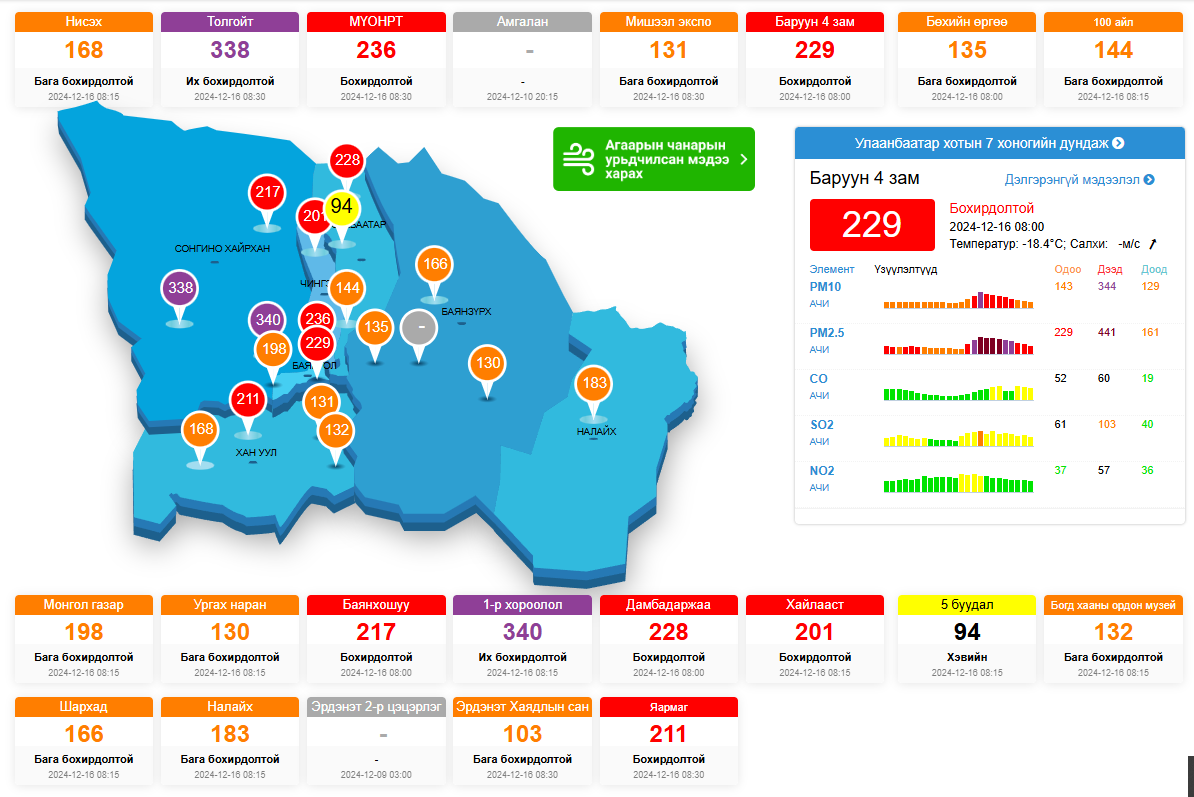 Агаар.мн сайтын өнөөдөр /2024.12.26/ 08 цагийн байдлаар гаргасан мэдээллээр МҮОНРТ, Баруун 4 зам, Баянхошуу, Дамбадаржаа, Хайлааст, Яармаг зэрэг цэгүүдэд агаар хамгийн их бохирдолтой байна. Харин Нисэх, Мишээл экспо, Бөхийн өргөө, 100 айл, Монгол газар, Ургах наран, Богд хааны ордон музей, Шархад, Налайх, Эрдэнэт хаягдлын сан зэрэг газруудад агаар бага бохирдолтой байгаа юм.