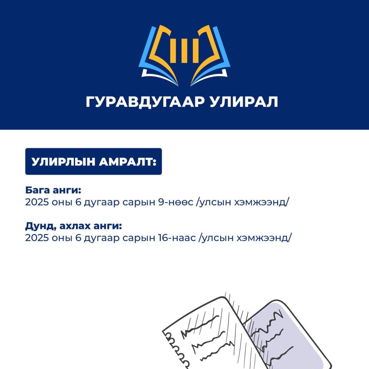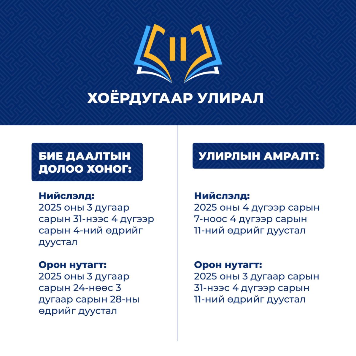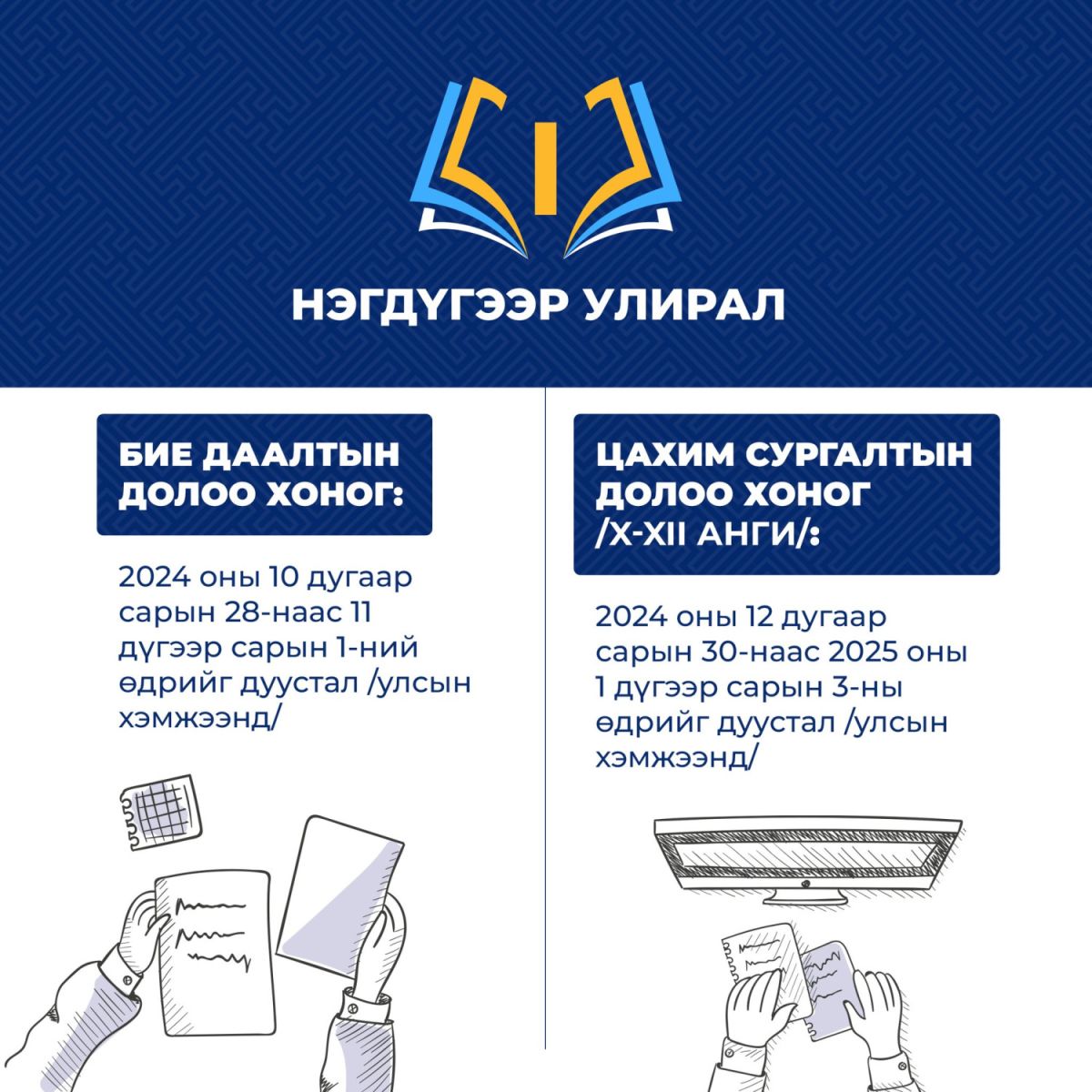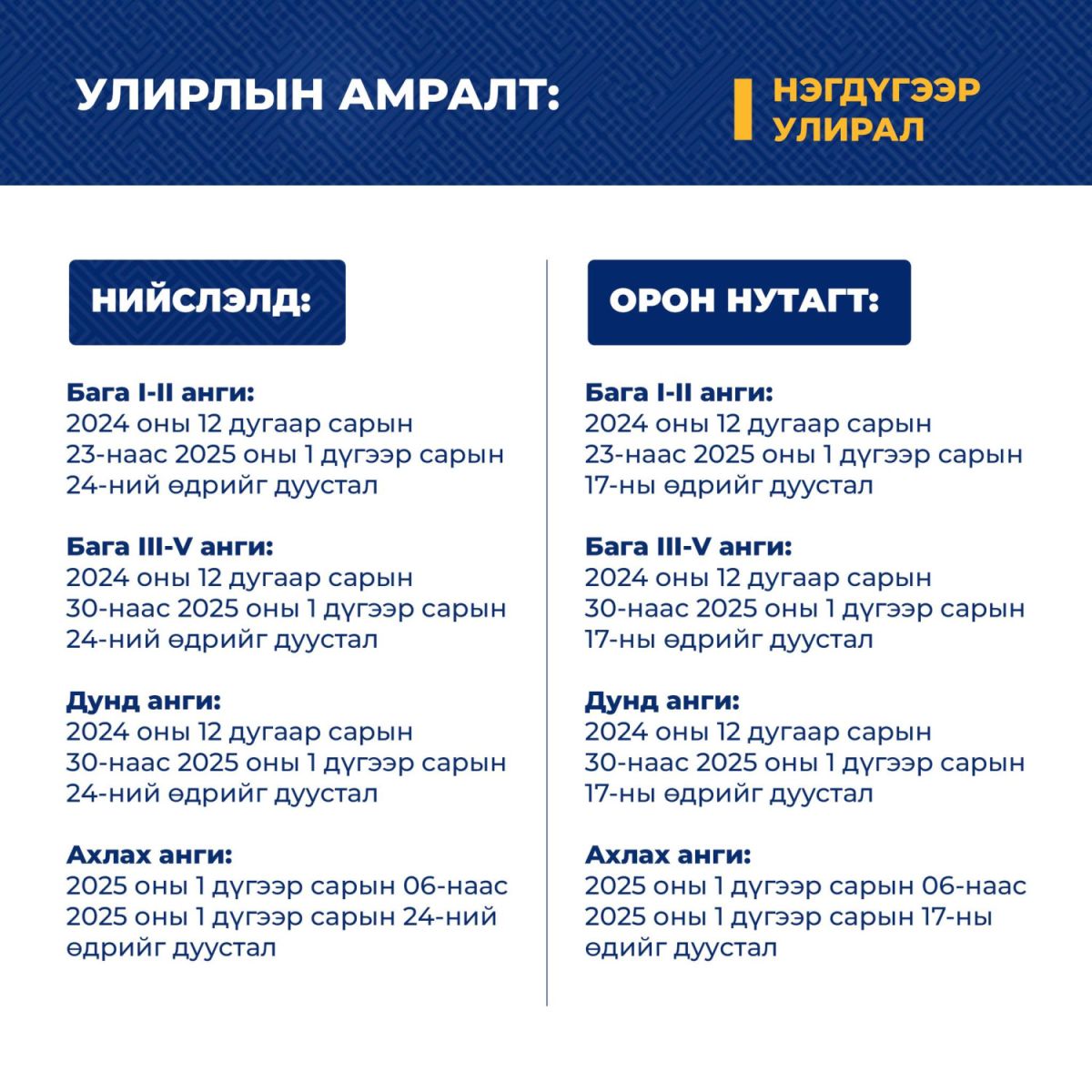 Боловсролын яамнаас гаргасан 2024-2025 оны хичээлийн жилийн бүтцийн дагуу сурагчдын нэгдүгээр улирлын амралтын хуваарийг танилцуулж байна.