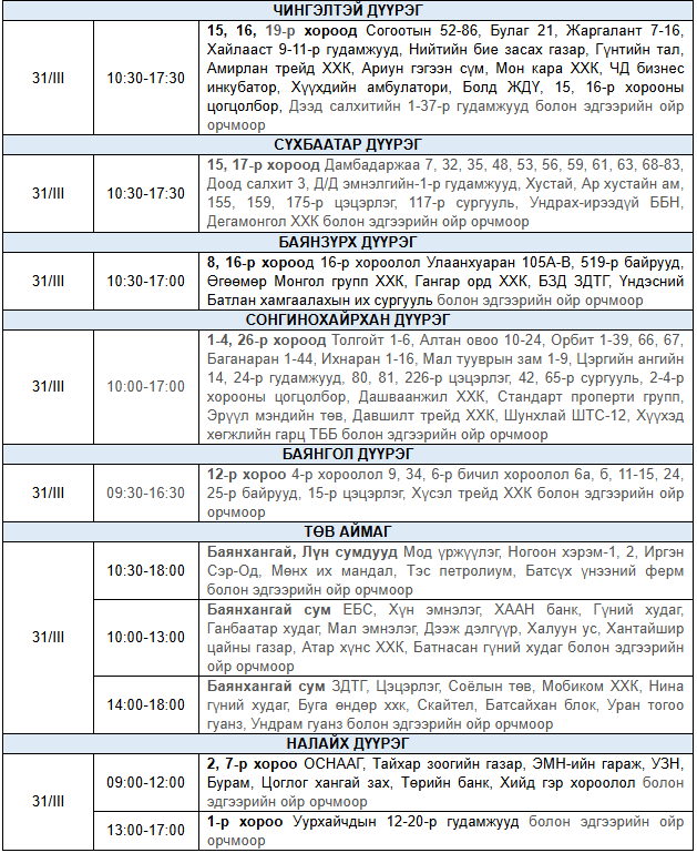 Өнөөдөр /2025.03.31/ дараах зургаан дүүрэгт цахилгаан хязгаарлаж, төлөвлөгөөт засвар үйлчилгээг хийхийг УБЦТС ТӨХК-аас мэдээллээ. Мөн Төв аймгийн зарим сумдад цахилгаан хязгаарлалт хийх аж.