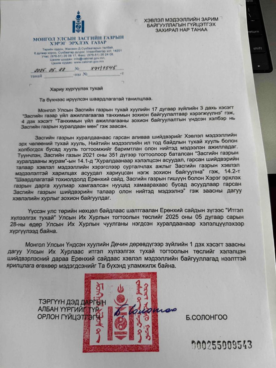 Ингэхдээ "Үүссэн улс төрийн нөхцөл байдлаас шалтгаалан Ерөнхий сайдын зүгээс "Итгэл хүлээлгэх тухай" УИХ-ын тогтоолын төслийг УИХ-ын чуулганы нэгдсэн хуралдаанаар хэлэлцүүлэхээр тавдугаар сарын 28-нд хүргүүлээд байна.