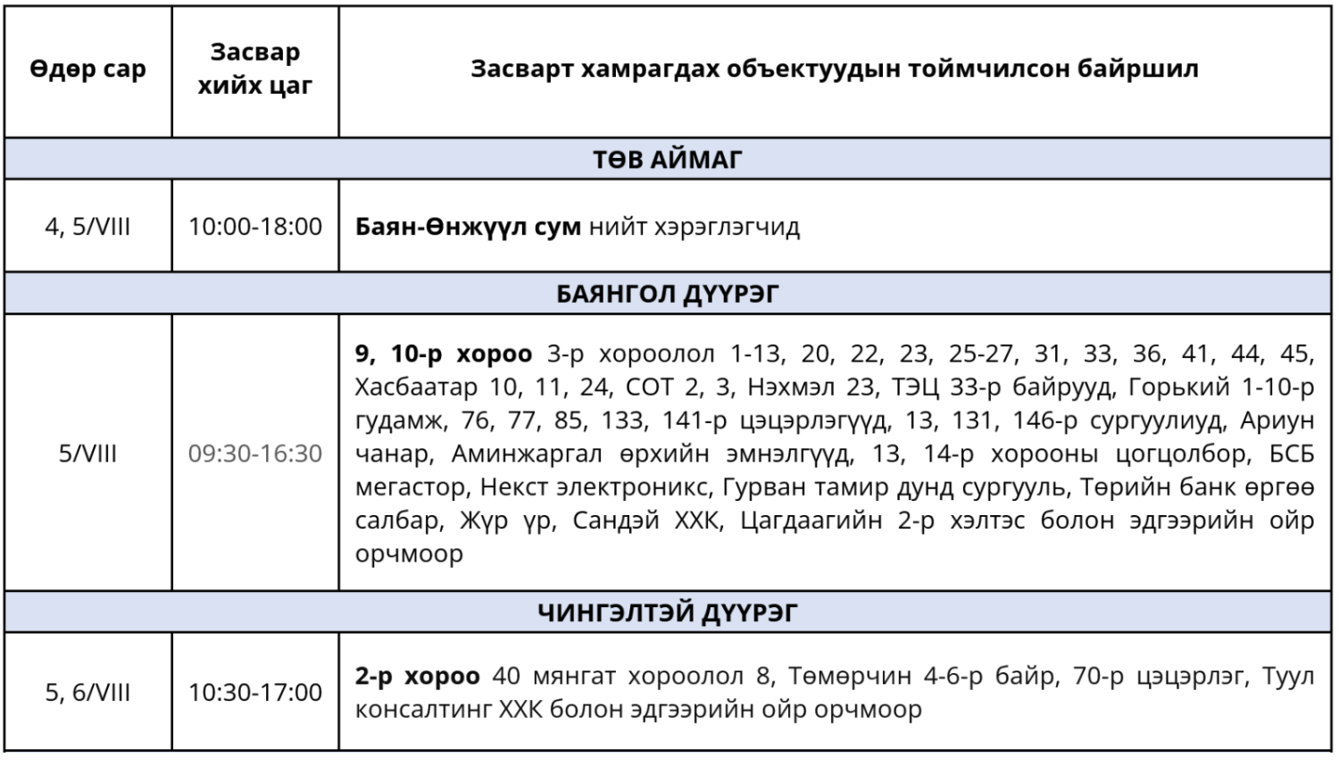 ЖИЧ: Цаг агаарын нөхцөл байдлаас шалтгаалан хуваарьт өөрчлөлт орвол, гэрээт бүртгэлтэй утасны дугаарт мэдээлэл хүргэх болно. Засварын ажлыг тухайн тоноглолоос хүчдэлээс бүрэн чөлөөлсний дараа хийдэг нөхцөл байдлыг харгалзан үзэж, хүлээцтэй хандахыг хэрэгчлэгч та бүхнээс хүсье.