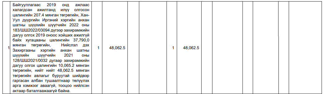 Улмаар 3 тэрбум 993 сая 362 мянган төгрөгийн дөрвөн албан шаардлагыг хүргүүлж, 183 сая 510 мянган төгрөгийн дөрвөн зөвлөмж өгчээ.