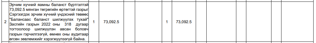 Эрчим хүчний яамны баланст бүртгэлтэй 73 сая 92 мянган төгрөгийн өртөгтэй газрыг Сэргээгдэх эрчим хүчний үндэсний төвөөс шилжүүлэн авсан гэх боловч газрын гэрчилгээгүй байна.