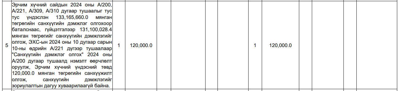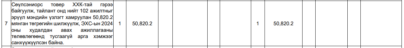 Сөүлсэниорс товер ХХК-тай гэрээ байгуулж, нийт 102 ажилтныг эрүүл мэндийн үзлэгт хамруулан 50 сая 820 мянган төгрөгийн шилжүүлжээ. Энэ нь Эрчим хүчний сайдын 2024 оны худалдан авах ажиллагааны төлөвлөгөөнд тусгаагүй арга хэмжээ аж.