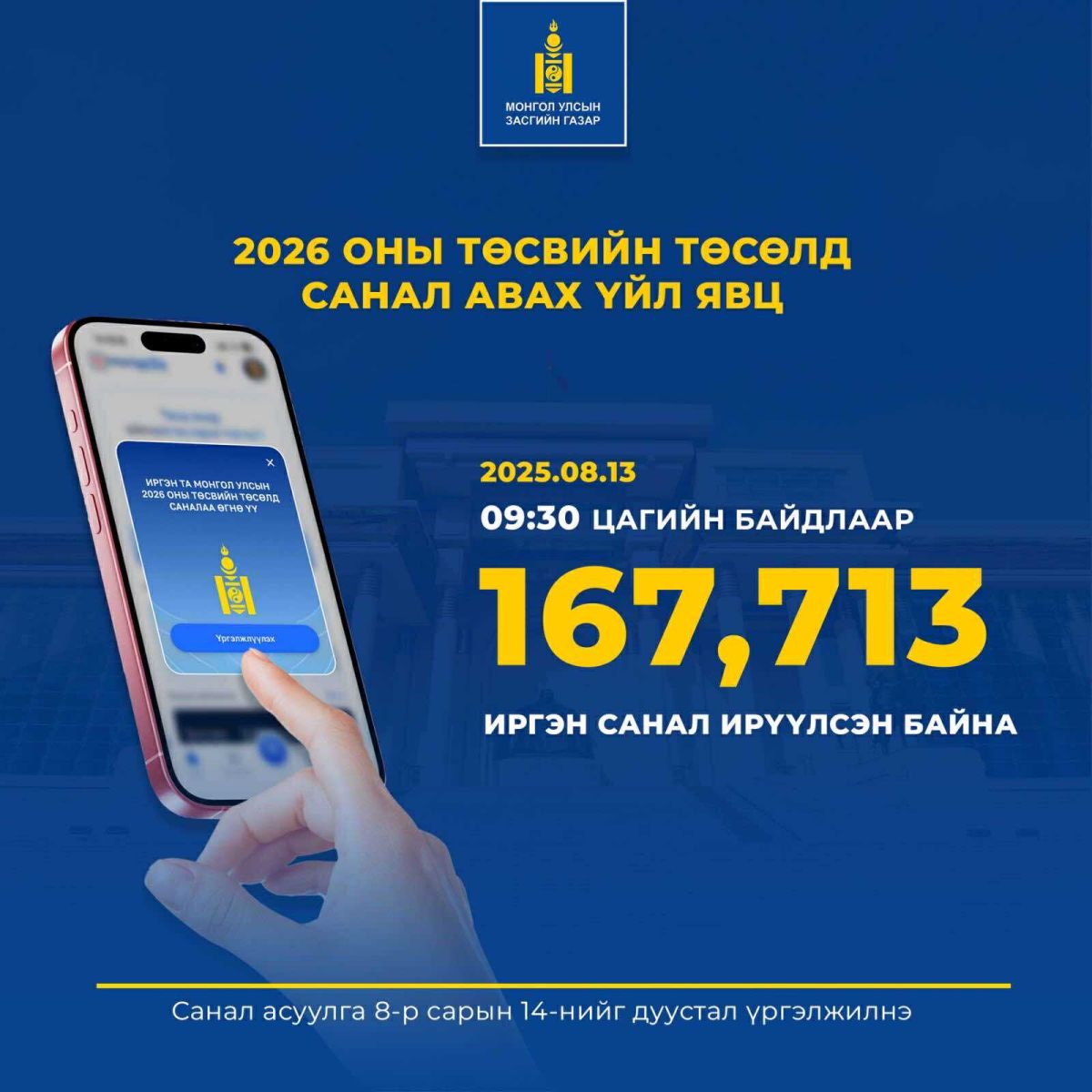 Монгол Улсын 2026 оны төсвийн төсөлд иргэд, олон нийтийн саналыг "E-Mongolia" цахим системээр дамжуулан авах хугацаа маргааш (2025.08.14) дуусна.