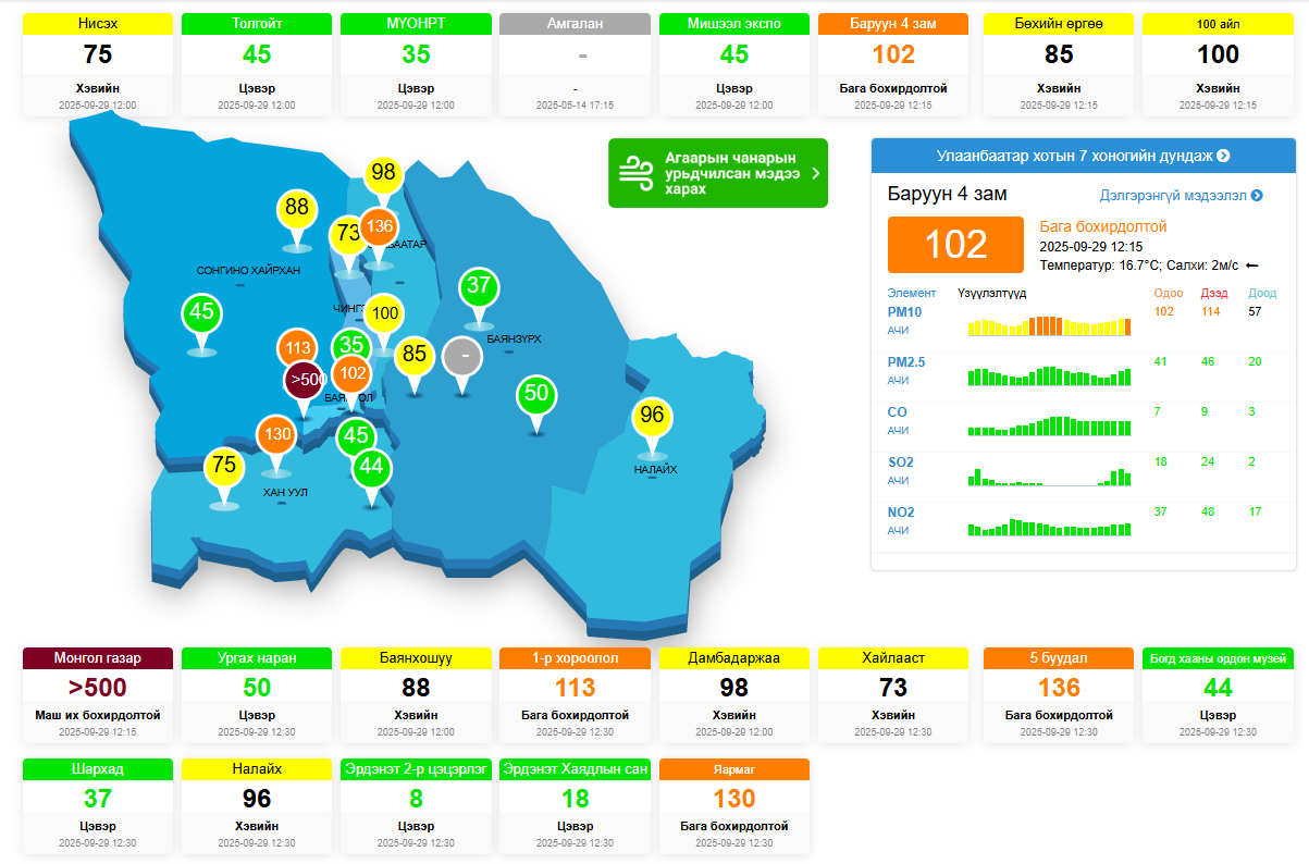 Агаарын чанарын индекс Монгол газар буюу Баянгол дүүргийн 20 дугаар хороо, Цахилгаан станц орчим 500 давж "маш их бохирдолтой" гэсэн үзүүлэлтийг заажээ. Харин Баруун 4 зам, 1 дүгээр хороолол, 5 буудал, Яармаг зэрэг газрууд "бага бохирдолтой" байгаа бол бусад газар агаар "хэвийн" болон "цэвэр" гэсэн үзүүлэлтийг зааж байна.
