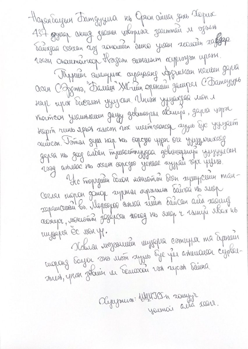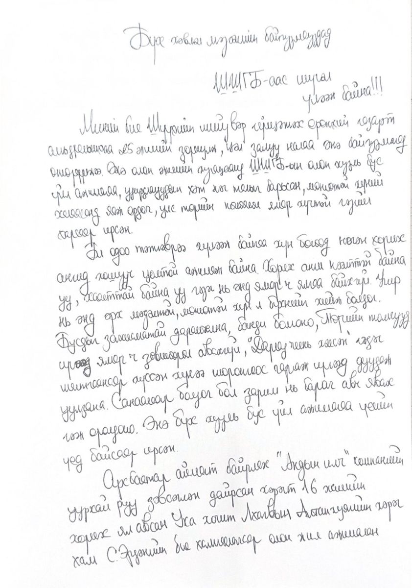 Тэрбээр "Миний бие Шүүхийн шийдвэр гүйцэтгэх ерөнхий газарт амьдралынхаа 25 жилийг зориулж, цэл залуу насаа энэ байгууллагад өнгөрүүлжээ. Энэ олон жилийн хугацаанд Шүүхийн шийдвэр гүйцэтгэх байгууллагын олон хууль бус үйл ажиллагаа, удирдлагуудын хэт нэг талыг барьсан, мөнгөтэй хүний халаасанд яаж ордог, улс төрийн нөлөөлөл ямар хүчтэй гэдгийг харсаар ирсэн.