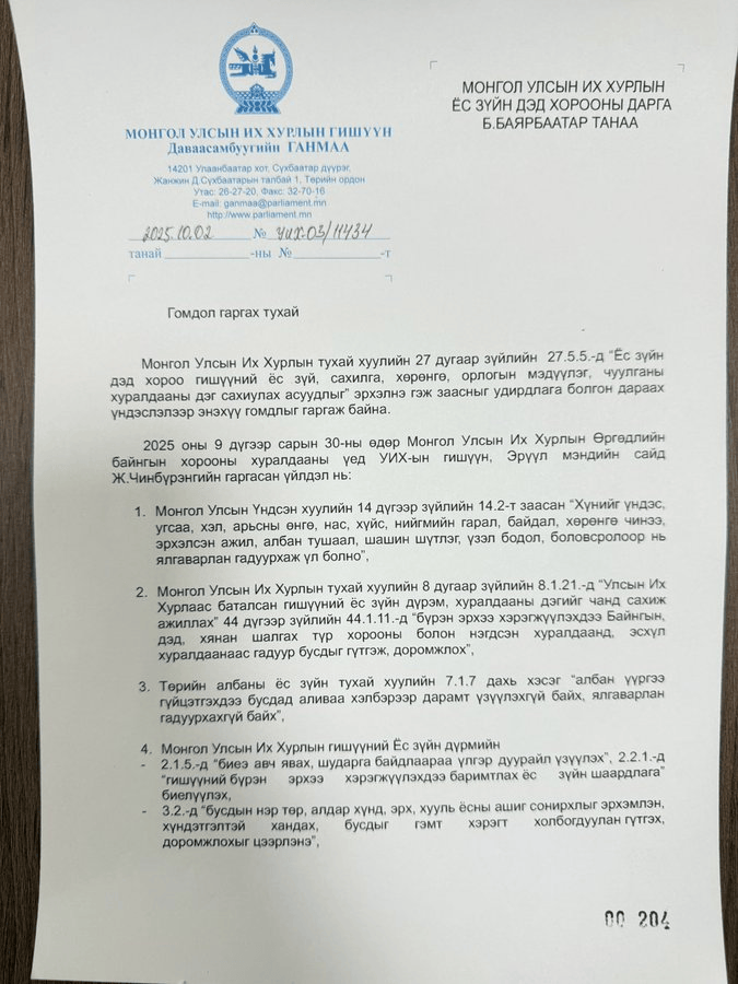 Тэгвэл УИХ-ын гишүүн Д.Ганмаа Эрүүл мэндийн сайд Ж.Чинбүрэнг УИХ-ын Ёс зүйн дэд хороонд өгч буйгаа өөрийн цахим хуудастаа мэдэгдэв.