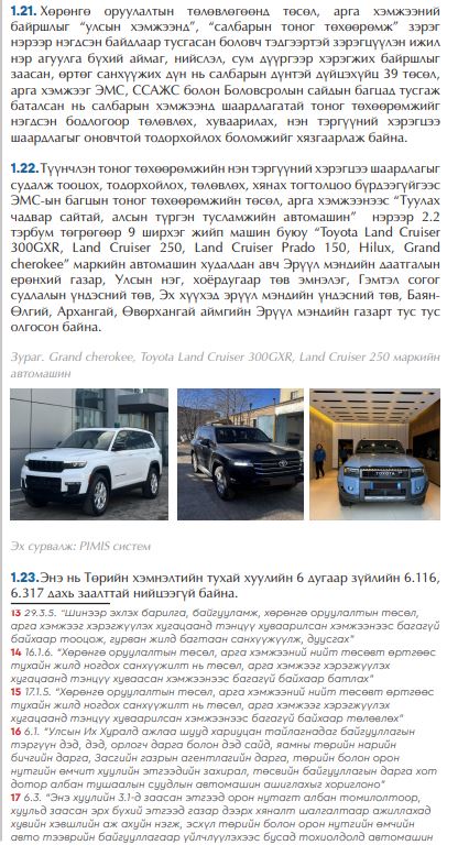 Шалгалтаар, Эрүүл мэндийн сайдын багцын тоног төхөөрөмжийн төсөл арга хэмжээнээс “Туулах чадвар сайтай, алсын түргэн тусламжийн автомашин авах” нэрээр 2.2 тэрбум төгрөгөөр 9 ширхэг жийп машин авсан зөрчлийг илрүүлсэн байна.