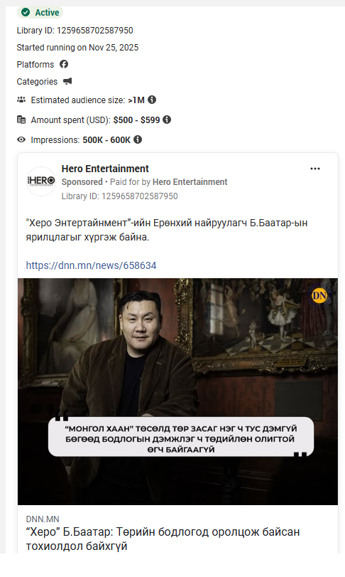 "Херо Энтертайнмент”-ийн Ерөнхий найруулагч Б.Баатар өнгөрөгч арваннэгдүгээр сарын 25-нд "Өдрийн сонин"-д ярилцлага өгчээ.