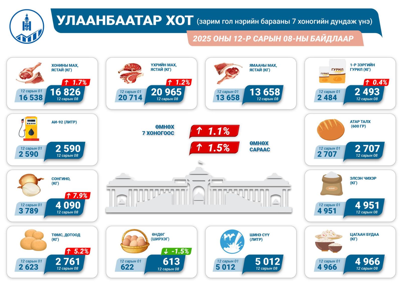 2025 оны арванхоёрдугаар сарын 8-ны байдлаар гол нэрийн зарим барааны үнэ өмнөх сараас 1.5 хувь, өмнөх 7 хоногоос 1.1 хувиар тус тус өссөн байна.