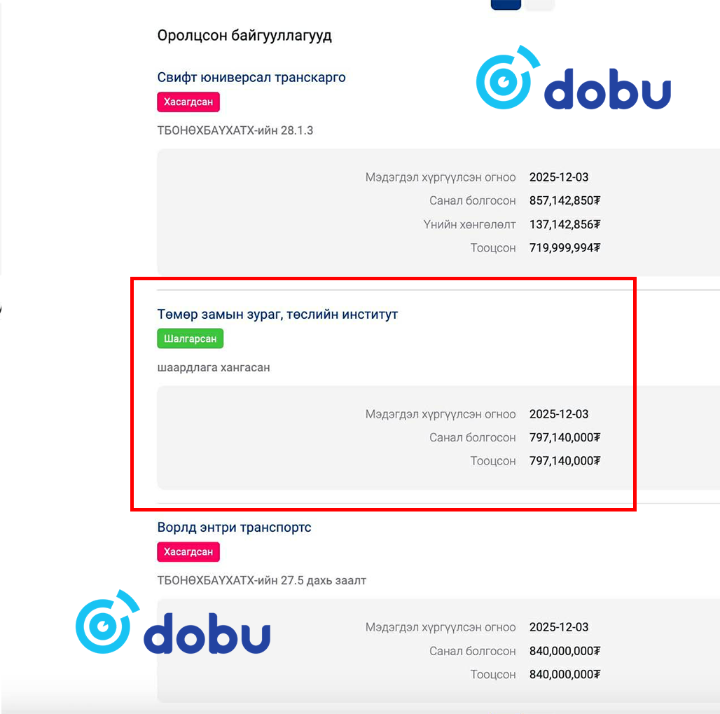 “Монголын эзэн” Д.Эрдэнэбилэг 2015 онд өөрийн төрсөн эгч Д.Оюуны нэр дээр дээр дурдсан “Төмөр замын зураг төслийн институт” компани байгуулж, Хандгайт өртөөний 25 километр замыг Дорнод аймгийн Чингисийн даланг хуулж авчран тавьж маргаан дэгдээж байв. Мөн Дарханы төмөрлөгийн үйлдвэрийн мөнгөөр 300 вагон худалдан авч, энэхүү 300 вагоноо тендерт ялаад буй “Төмөр замын зураг төслийн институт” компанийнхаа нэр дээр оруулж ирсэн байдаг. Энэ тухайд Засгийн газрын хэрэг эрхлэх газрын даргаар ажиллаж байсан Д.Амарбаясгалан асуудал үүсгэн, АТГ-т шалгуулж байсан мэдээлэл нь ч бий.