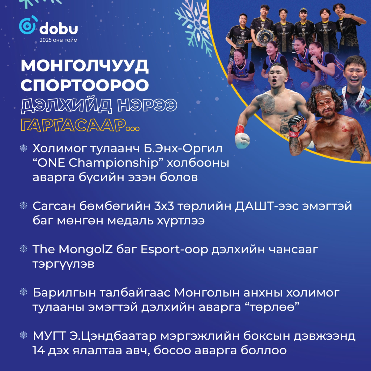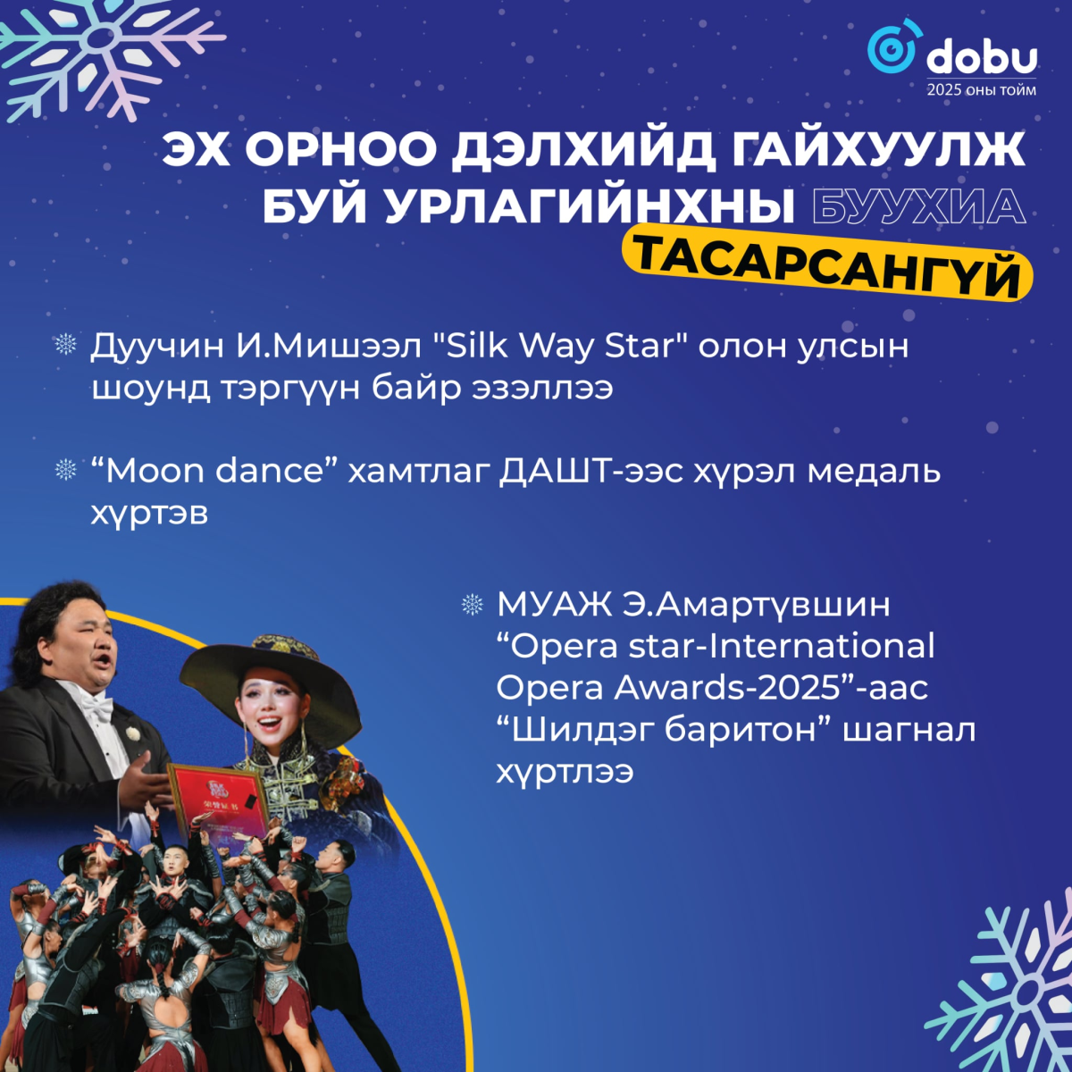 Сайнтай, муутай өдөр хоногууд өнгөрсөөр бид дахин нэг жилийг ардаа үдэж байна. Амьдрал яг л өнөөхөөрөө үргэлжилж, утаатай, түгжрэлтэй, үертэй, хэрүүлтэй, тоггүй, усгүй байдал ээлжилсэн 365 хоногийн ард гарчээ. Гэсэн ч энэ өдрүүдэд өнгө нэмж, гэрэл гийсэн явдлууд цөөнгүй тохиолдож байв. Ийм л явдлуудаас баяр баясал, омогшил бахархал, итгэл үнэмшлийг мэдэрч хүнд өдрүүдийг давсан байх. Ингээд 2025 онд Монгол Улсад болж өнгөрсөн үйл явдлуудаас гэрэл гэгээтэйг нь тоймлон хүргэж байна.
