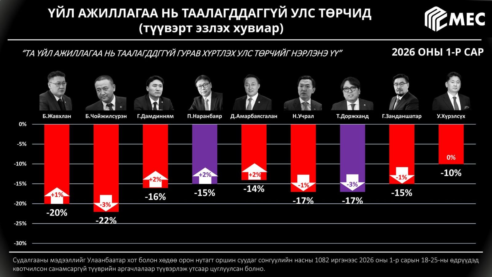 "МЭК" судалгааны байгууллагаас улс төрчдийн рейтингийн судалгааг сар бүр хийж, танилцуулдаг билээ. Уг судалгааны нэгдүгээр сарын дүн гарчээ.