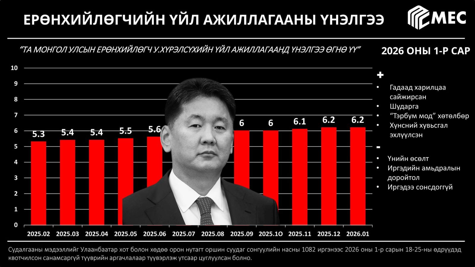 Ерөнхийлөгч У.Хүрэлсүхийн рейтинг хэвээр байна. Тодруулбал, түүний үйл ажиллагаанд иргэд өнгөрөгч арванхоёрдугаар сард 10-аас 6.2 оноо өгч байсан бол нэгдүгээр сард ч энэ оноо хэвээр байгаа юм. Ингэхдээ "Гадаад харилцаа сайжирсан", "Шударга", "Тэрбум мод хөтөлбөр", "Хүнсний хувьсгал эхлүүлсэн" гэх зэргээр сайшаажээ. Харин "Үнийн өсөлт", "Иргэдийн амьдралын доройтол", "Иргэдээ сонсдоггүй" хэмээн сөрөг сэтгэгдэл хэлсэн байна.