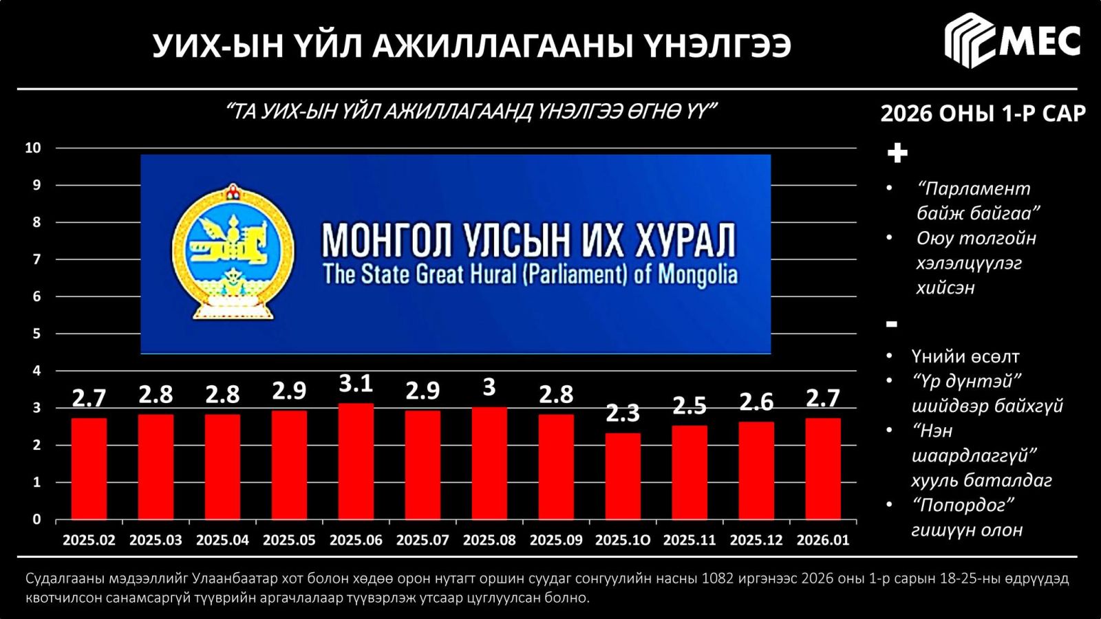 УИХ-ын рейтинг өсжээ. Тодруулбал, өнгөрөгч арванхоёрдугаар сард иргэдээс 2.6 оноо авч байсан бол нэгдүгээр сард 2.7 болсон байгаа юм. Иргэд УИХ-ыг дүгнэхдээ "Байж л байгаа", "Оюутолгойн хэлэлцүүлэг хийсэн", "Үнийн өсөлт", "Үр дүнтэй шийдвэр байхгүй", "Нэн шаардлагагүй хууль баталдаг", "Попордог гишүүн олон" гэсэн байна.