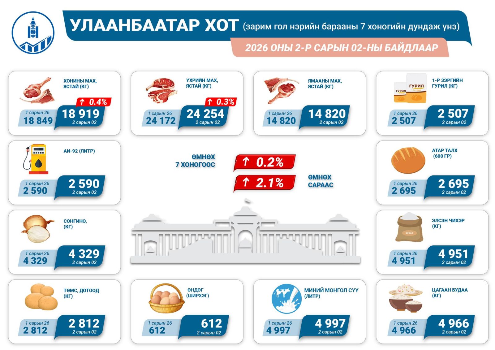 Үндэсний статистикийн хорооноос хүнсний нэрийн гол бараа, бүтээгдэхүүний үнийн талаар статистикийг гаргажээ. 2026 оны хоёрдугаар сарын 02-ны байдлаар Улаанбаатар хотын гол нэрийн хүнсний барааны дундаж үнэ өмнөх сараас 2.1 хувь, харин өмнөх долоо хоногоос 0.2 хувиар нэмэгдсэн байна.