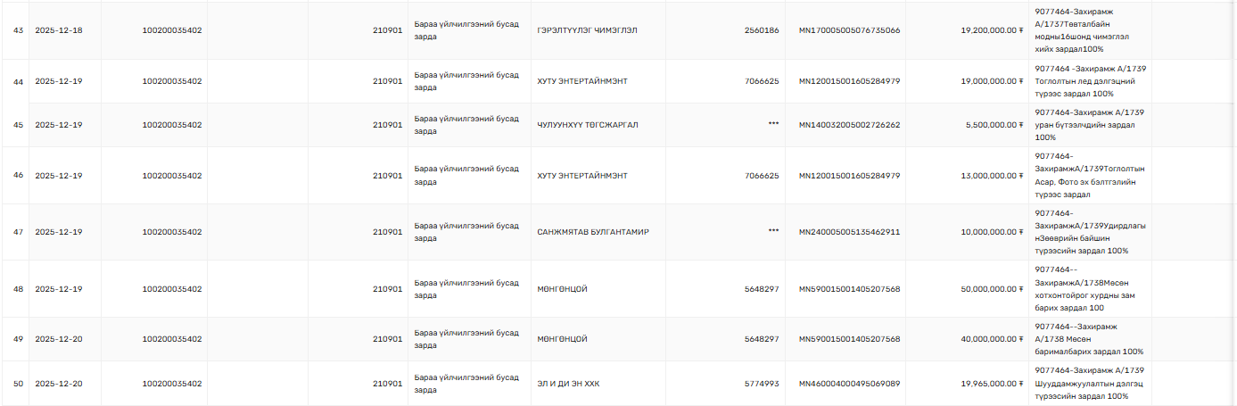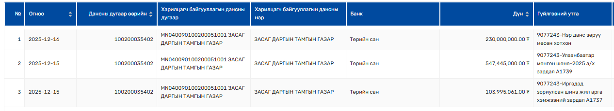 Тодруулбал, арванхоёрдугаар сарын 15-нд Нийслэлийн Засаг даргын тамгын газраас Нийслэлийн Соёл урлагийн газар руу "Улаанбаатар мөнгөн шөнө а/х зардал" гэсэн утгатайгаар 547 сая 445 мянган төгрөг шилжүүлсэн байгаа юм. Мөн "Иргэдэд зориулсан шинэ жилийн арга хэмжээний зардал" нэрээр 103 сая 995 мянган төгрөг, "Мөсөн хотхон" нэрээр 230 сая төгрөг шилжүүлсэн байна.
