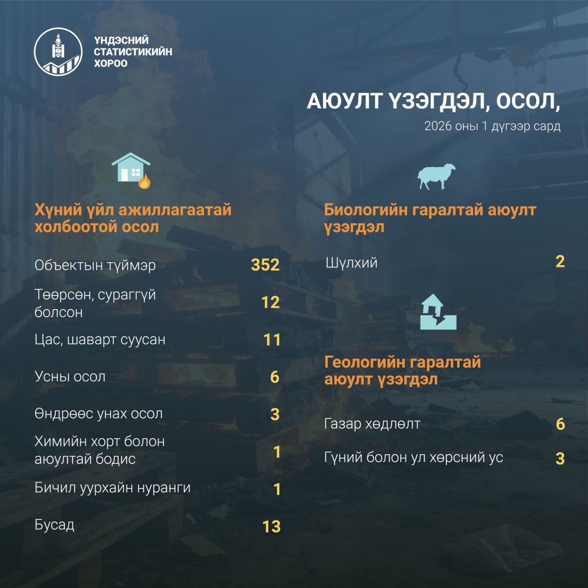 2026 оны нэгдүгээр сард улсын хэмжээнд аюулт үзэгдэл, ослын 410 тохиолдол бүртгэгдэж, өмнөх оны мөн үеэс 53 тохиолдлоор буюу 14.8 хувиар өссөн байна.