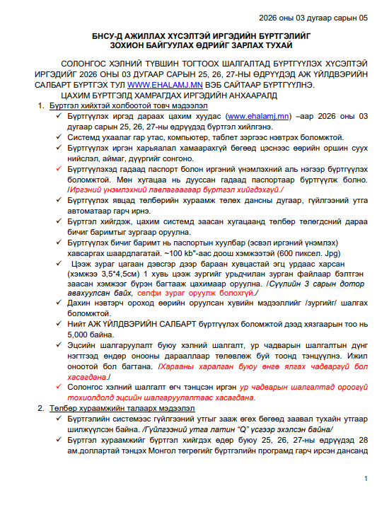 -Бүртгэлийг цуцлуулах зайлшгүй шаардлага гарвал /2026 оны 04-р сарын 10-ны дотор ХХҮЕГ-т бичгээр хүсэлт гаргаж /орон нутгийн иргэд аймаг, дүүргийн Хөдөлмөр, халамжийн үйлчилгээний газарт хандаж хураамжийг буцаан авах боломжтой. Дээрх хугацаанд хүсэлт гаргаагүй тохиолдолд буцаан олгох боломжгүй.