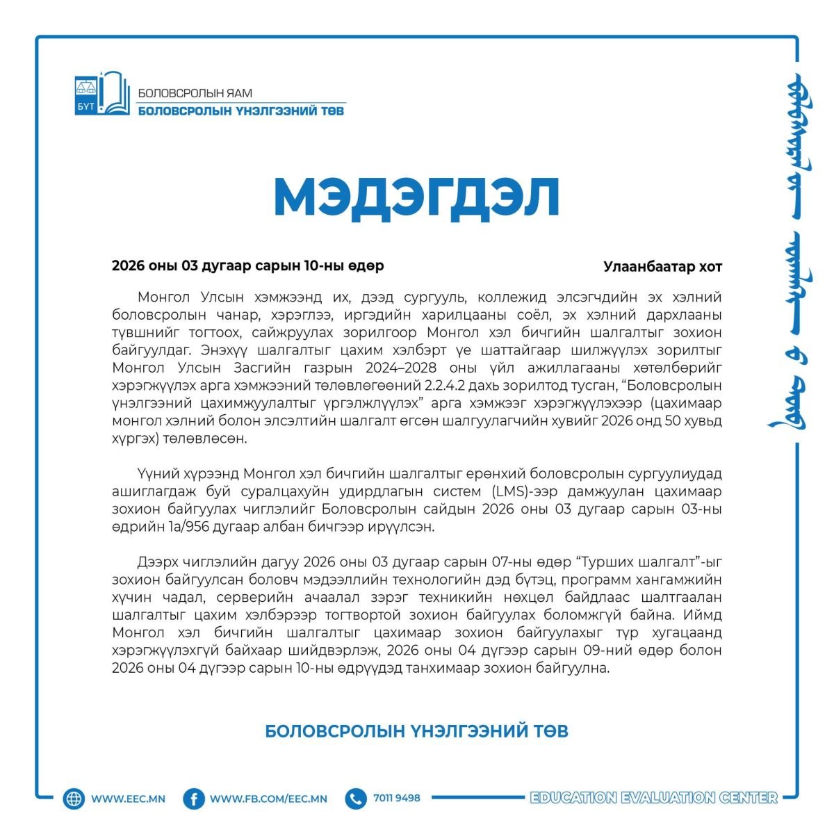 Үүний хүрээнд Монгол хэл бичгийн шалгалтыг ерөнхий боловсролын сургуулиудад ашиглагдаж буй суралцахуйн удирдлагын систем (LMS)-ээр дамжуулан цахимаар зохион байгуулах чиглэлийг Боловсролын сайдын 2026 оны гуравдугаар сарын 03-ны өдрийн 1а/956 дугаар албан бичгээр ирүүлсэн байна. Дээрх чиглэлийн дагуу 2026 оны гуравдугаар сарын 07-ны өдөр “Турших шалгалт”-ыг зохион байгуулсан боловч мэдээллийн технологийн дэд бүтэц, программ хангамжийн хүчин чадал, серверийн ачаалал зэрэг техникийн нөхцөл байдлаас шалтгаалан шалгалтыг цахим хэлбэрээр тогтвортой зохион байгуулах боломжгүй болжээ. Иймд Монгол хэл бичгийн шалгалтыг цахимаар зохион байгуулахыг түр хугацаанд хэрэгжүүлэхгүй байхаар шийдвэрлэж, 2026 оны дөрөвдүгээр сарын 09-ний өдөр болон дөрөвдүгээр сарын 10-ны өдрүүдэд танхимаар зохион байгуулах аж" гэлээ.