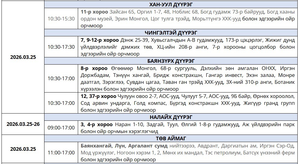 Өнөөдөр (2026.03.25) цахилгааны хязгаарлалт хийж, цахилгаан шугам тоноглолд засвар үйлчилгээ хийх байршлуудын мэдээллийг хүргэж байна.