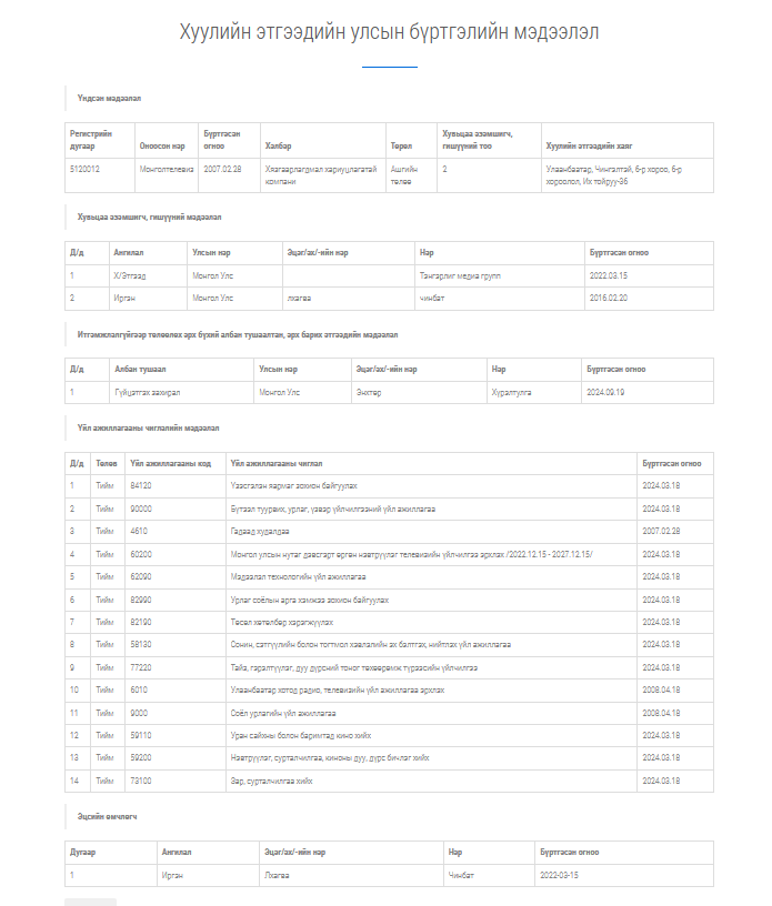 "Монгол телевиз"-ийн бүртгэлийн мэдээлэл: