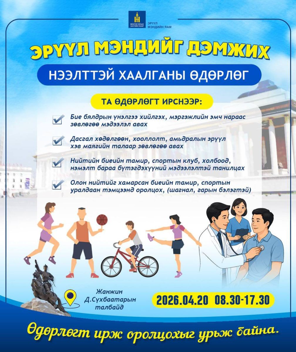 Өдөрлөгт эрүүл мэнд, спортын чиглэлээр үйл ажиллагаа явуулдаг 60 байгууллага оролцож үзлэг, зөвлөгөө мэдээлэл өгч ажиллах аж.