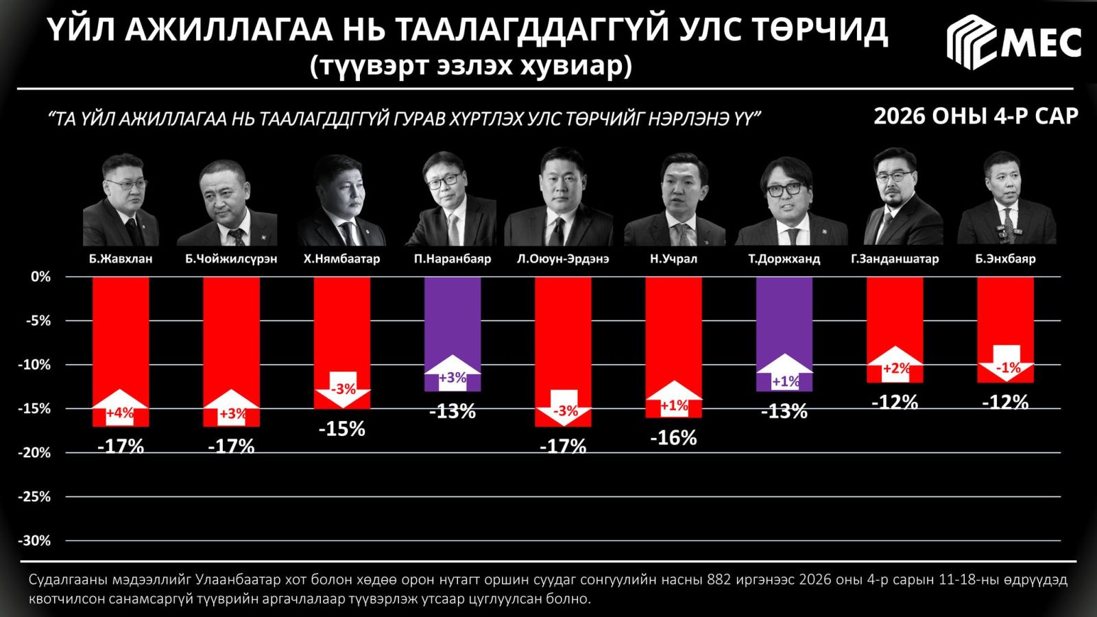 "МЭК" судалгааны байгууллагаас улс төрчдийн рейтингийн судалгааг сар бүр хийж, танилцуулдаг билээ. Уг судалгааны дөрөвдүгээр сарын дүн гарчээ.