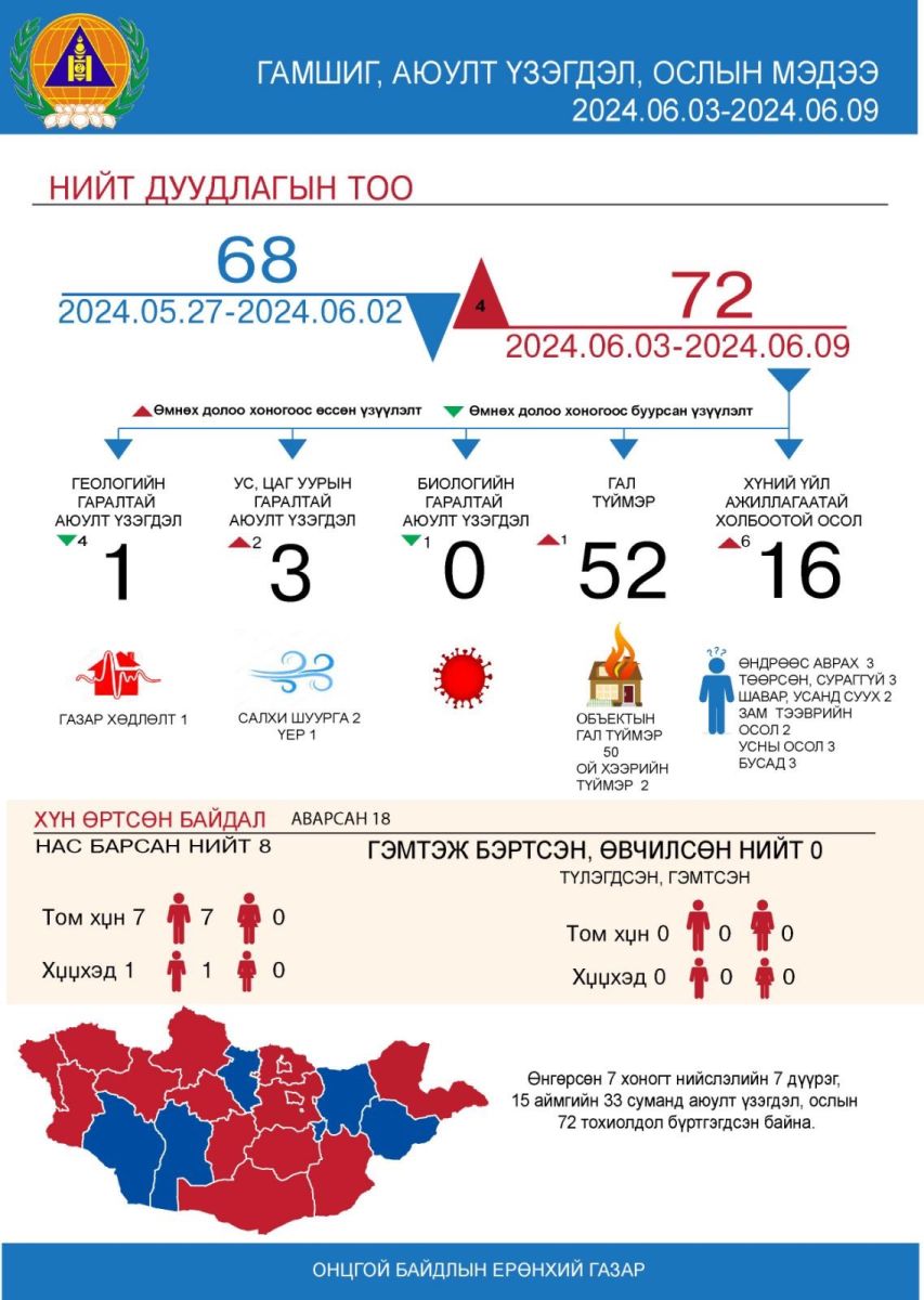 Улсын хэмжээнд өнгөрсөн долоо хоногт /2024.06.03-09/ нийслэлийн 7 дүүрэг, 15 аймгийн 33 суманд аюулт үзэгдэл, ослын 72 удаагийн дуудлага бүртгэгдлээ.